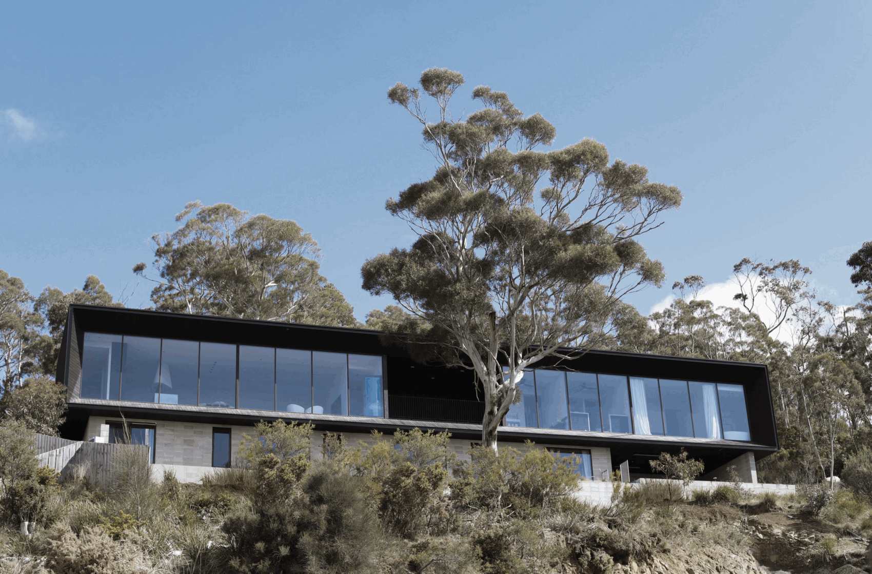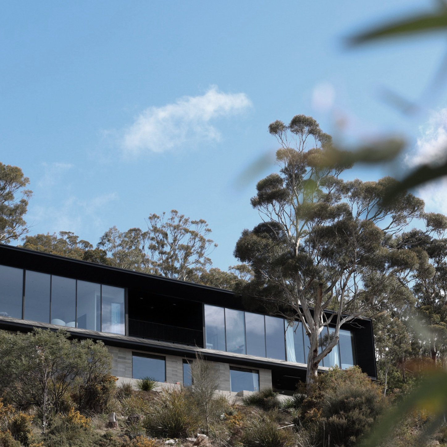 Perched high on the hillside, A Hill House is a contemporary home designed to capture sweeping views of the landscape and the River Derwent. Strong geometric lines, expansive glazing and a crisp, modern palette define its architecture. Integrated with the slope, the house offers dramatic outlooks and light-filled interiors, creating a refined retreat that celebrates modern design and its spectacular Tasmanian setting.