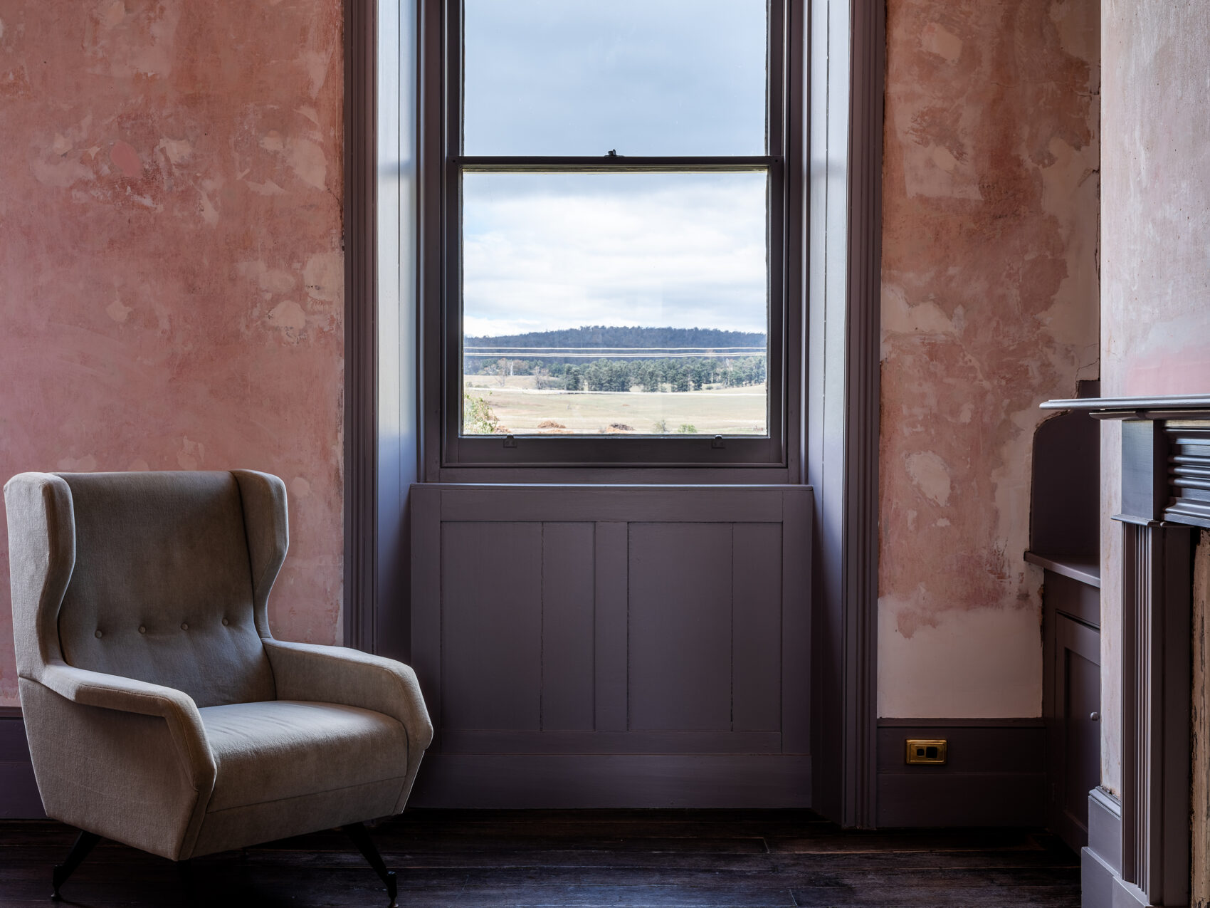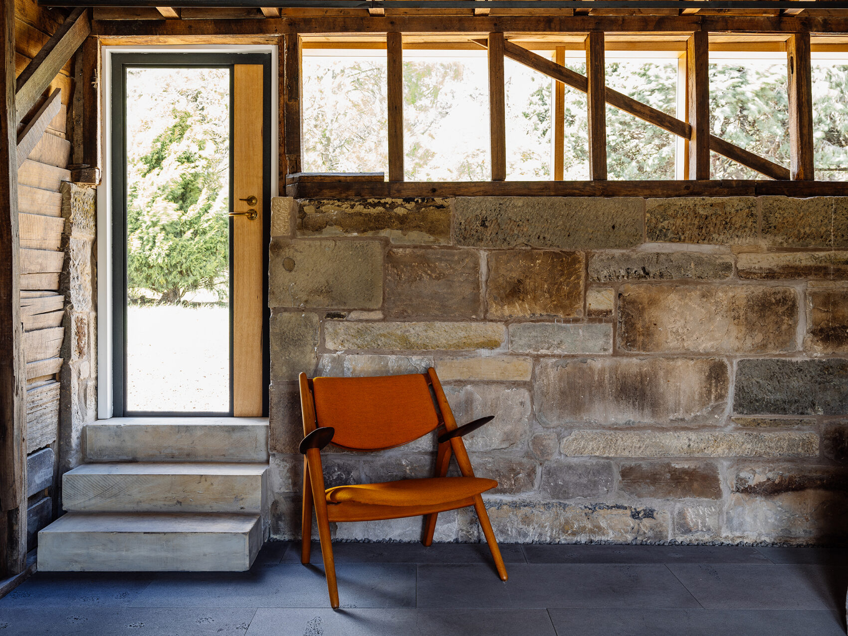 Inside, the house revealed a time capsule of early finishes—convict-sawn timber floors, cedar joinery, and original lime-based paints were carefully preserved or reinstated. Structural repairs to thick sandstone walls were discreetly completed using lime grout and stainless-steel reinforcement.