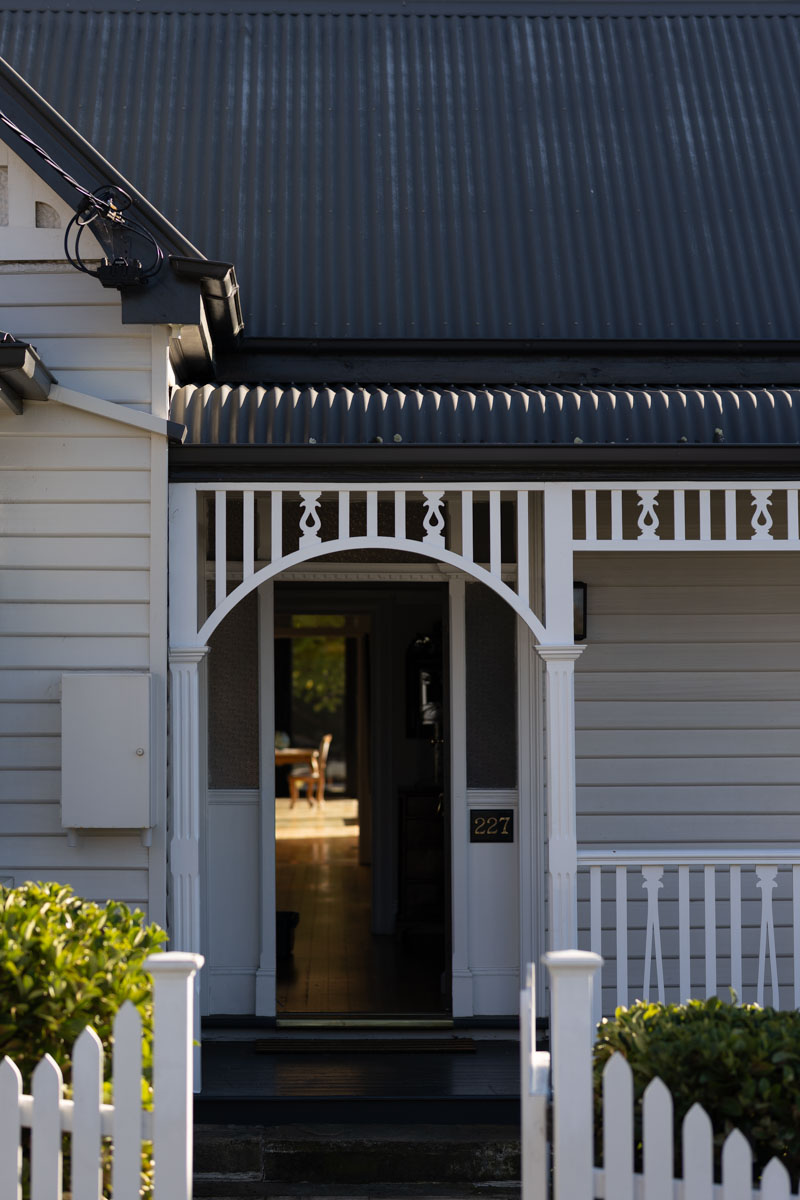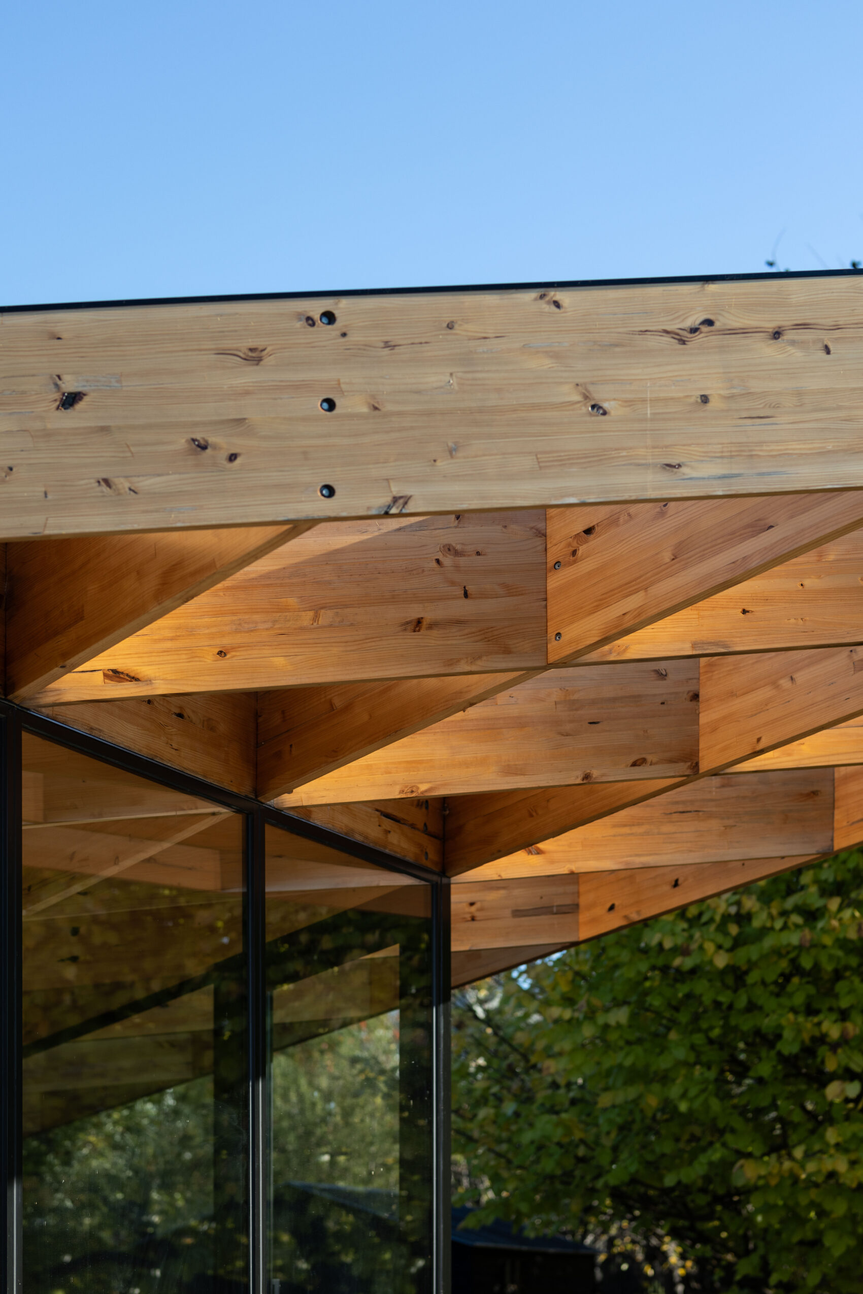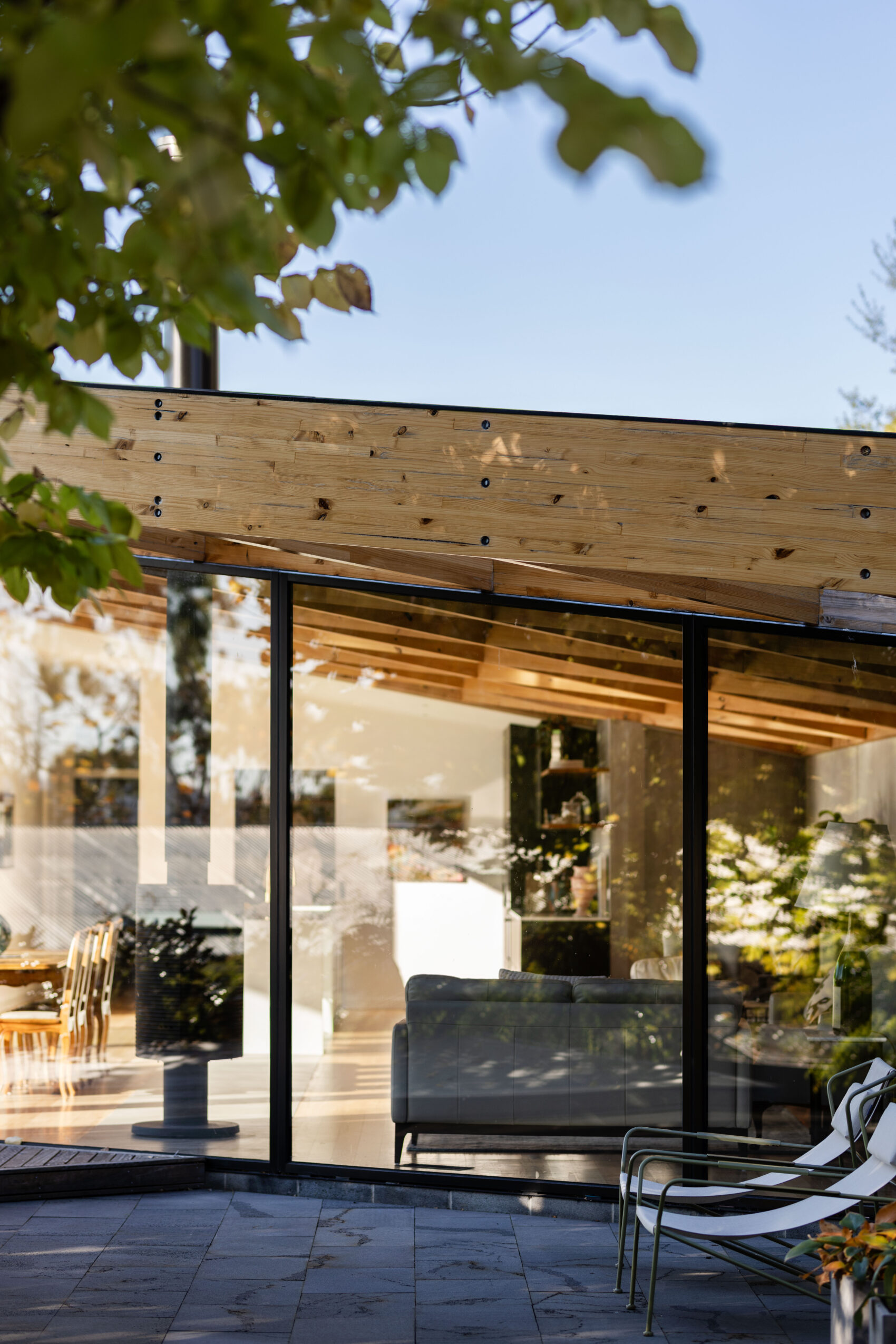 This renovation to a Federation-era weatherboard residence introduces a new open-plan lounge, kitchen, and dining volume articulated by a laminated timber triangulated roof structure. The expressed structural framework extends outward into the landscape, establishing a dynamic spatial dialogue between interior, exterior and existing Elm tree. Large operable glazed elements and deep overhangs mediate environmental conditions while visually and functionally dissolving the boundary between the built form and its natural context.